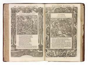 Quatrième édition de la traduction de Barthélémy Aneau, renfermant 203 emblèmes. # L'illustration comprend un bel encadrement à portique sur le titre, des encadrements variés à chaque page (excepté les tables), et 173 vignettes d'emblèmes et 14 figures au trait représentant diverses essences d'arbres, le tout gravé sur bois par Pierre Vase. # Séduisant exemplaire conservé dans sa première reliure. # Manque infime à la coiffe inférieure, pâle mouillure angulaire, dernière garde blanche rongée. # Baudrier, IX, 295 – Landwehr, Romanic, n°66