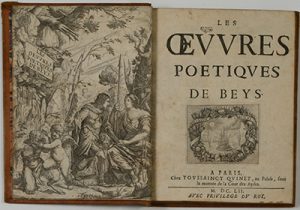 Édition originale, ornée d'un beau frontispice gravé à l'eau-forte. # On n'en connaît que très peu d'exemplaires, dont le titre porte indifféremment la date de 1651 ou celle de 1652. # Les pièces liminaires contiennent douze sonnets, stances et épigrammes adressés à l'auteur par Scarron, Guillaume et François Colletet, Jean Royer de Prade, Tristan L'Hermite, Georges de Scudéry, Gabriel Gilbert, etc. Ces pièces témoignent de la vive admiration que Charles Beys (1601-1659), qui composa certains de ses poèmes à l'âge de quatorze ans, suscita chez ses contemporains. # De la bibliothèque Hector de Backer (1926, I, n°722), avec ex-libris. # Reliure un peu frottée, un coin cassé, quelques rousseurs. Le frontispice étant d'une justification plus grande que le volume, il est comme toujours rogné au filet.