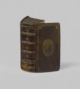 CÉSAR (Jules). Commentaires de la guerre des Gaules. Lyon, Jean de Tournes, 1555. 2 parties en un volume in-16, maroquin fauve, double filet doré, fleurons azurés aux écoinçons, médaillon d'arabesques ovale au centre, dos orné, tranches...