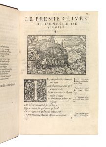 Première édition complète, en partie originale, de la traduction en vers de Louis Des Masures (1515-1574), poète wallon entré au service de la maison de Lorraine, ami de Ronsard et de Du Bellay. # Entreprise à la demande du cardinal Jean III de Lorraine, cette traduction de l'Énéide, qui demeure l'une des principales œuvres littéraires de son auteur, fut d'abord dédiée au cardinal Jean du Bellay puis au duc Charles III de Lorraine. Jean de Tournes en avait déjà publié les livres I à IV en 1552 (dont les deux premiers avaient précédemment paru à Paris, chez Chrétien Wechel, en 1547), et les livres V à VIII en 1557. Les livres IX à XII paraissent pour la première fois dans cette édition. # L'ouvrage est précédé de deux poèmes en hommage au traducteur : un sonnet de Joachim Du Bellay et une pièce latine de Georges de La Patrière accompagnée de sa traduction française. # Ce beau livre illustré lyonnais est orné de douze grandes vignettes gravées sur bois par Bernard Salomon, dont quatre en premier tirage. Admirablement imprimé en italiques, avec le texte latin en manchettes en petites italiques, le volume est orné de nombreuses lettrines à fond criblé et, sur le titre, du bel encadrement de grotesques et arabesques que Jean de Tournes avait inauguré dans la Cyropédie de 1555 et d'une de ses marques typographiques aux deux vipères. # Superbe exemplaire relié en maroquin grenat, dont le décor doré, azuré et à froid est inspiré des belles reliures lyonnaises du XVIe siècle. # De la bibliothèque René Choppin (1920, I, n°122), avec ex-libris. # Cartier, n°467 – J. P. Barbier : MBP, IV/1, n°86 – A. Cuillière, « Bibliographie de Louis Des Masures, de 1547 à 1615 », Bibliothèque d'Humanisme et Renaissance, XLVII, 1985, pp. 637-656.