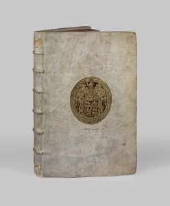 GIOVIO (Paolo). Elogia virorum bellica virtute illustrium. Bâle, Pietro Perna [pour Heinrich Petri], 1575. In-folio, vélin rigide ivoire, pièces ovales de veau fauve ornées de grandes armoiries dorées contrecollées au centre des plats, dos à...
