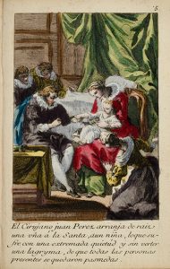 Suite de 59 planches gravées en taille-douce par Le Bas, en épreuves coloriées, précédée d'une planche de texte gravé repliée contenant la dédicace à don Diego Antonio de Parada Vidaurre, archevêque de Lima, qui fait office de titre. # Les estampes illustrent la vie de Rose de Lima (1586-1617), première sainte du Nouveau Monde et sainte patronne des Amériques, de l'Amérique latine, du Pérou et des Philippines. Les légendes en espagnol sont traduites de la Vie de sainte Rose de Sainte-Marie du missionnaire Jean-Baptiste Feuillet. # D'une grande rareté. # Premier plat détaché. # Leclerc, Bibliotheca americana, 1867, n°376.
