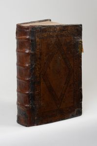 veau fauve, décor estampé à froid de type losange-rectangle composé de deux roulettes à portraits, vasques et rinceaux, dos muet, fermoirs de laiton ciselé et de peau tannée, l'un complet et l'autre incomplet, tranches lisses (Reliure de l'époque).
