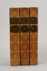 MARGUERITE DE NAVARRE. Les Nouvelles. Berne, Nouvelle Société typographique, 1780-1781. 3 volumes in-8, maroquin rouge à long grain, triple filet doré, dos lisse orné, pièces de titre et de tomaison prune, filet sur les coupes, dentelle...