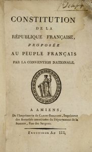 La Déclaration des droits de l'homme et du citoyen, mise à la portée de tout le monde, & comparée avec les vrais principes de toute société. Paris, Baudouin, 1790. In-8 de 76 pp., broché, toutes marges. Troisième édition publiée l'année de l'originale par Charles Morel de Vindé. Marges un peu effrangées, titre sali. # Acte constitutionnel, précédé de la Déclaration des droits de l'homme et du citoyen, présenté au peuple français... le 24 juin 1793. S.l., Imprimerie des 86 Départemens et de la Société des Jacobins, s.d. [1793]. Plaquette in-8 de 8 pp., en feuilles, toutes marges, non coupé. Constitution du 6 messidor an I. Pâle mouillure au bas des feuillets. # Constitution de la République française, proposée au peuple français par la Convention nationale. Amiens, Caron-Berquier, fructidor an III [1795]. In-8, broché, couverture de papier dominoté bleu et blanc, toutes marges. Édition amiénoise de la Constitution du 5 fructidor an III, fondant le Directoire. Plaisant exemplaire broché dans sa couverture d'origine en papier dominoté. Ex-libris manuscrit sur le titre : J. Delaforge. Pâles mouillure en tête et en pied du volume, petits manques à la couverture. # Constitution de la République française. Amiens, Caron-Berquier, an IV [1795]. In-8 de 79 pp., broché, sans couverture, toutes marges. Pâle mouillure au bas des feuillets. # Constitution française, acceptée le 10 août 1793. – Déclaration des droits de l'homme et du citoyen. Manuscrit signé Palloy, patriote, daté du 8 ventôse an 3 [26 février 1795], reproduisant la gravure d'Aubert. [2] ff. in-folio, en feuilles. Chacun des deux textes est contenu dans un tableau manuscrit copié d'une écriture fine et serrée sur le recto d'un feuillet. Exemplaire défraîchi : manque marginal sans atteinte au texte, pâle mouillure et plis. # Constitution de la République française. Paris, Imprimerie de la République, s.d. [1799]. Plaquette in-8 de 20 pp., en feuilles, toutes marges. Constitution du 22 frimaire an VIII, fondant le Consulat. # On joint un exemplaire incomplet du Projet de déclaration des droits naturels, civils et politiques des hommes.