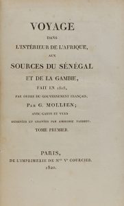 MOLLIEN (Gaspard). Voyage dans l'intérieur de l'Afrique, aux sources du Sénégal et de la Gambie, fait en 1818, par ordre du gouvernement français. Paris, Mme Ve Courcier, 1820. 2 volumes in-8, bradel cartonnage de papier rouge, dos lisse, pièces...
