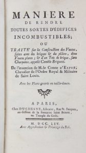 ESPIÉ (Félix-François d'). Manière de rendre toutes sortes d’édifices incombustibles ou Traité sur la combustion des voûtes, faites avec des briques & du plâtre, dites voûtes plates. Paris, Duchesne, 1754.