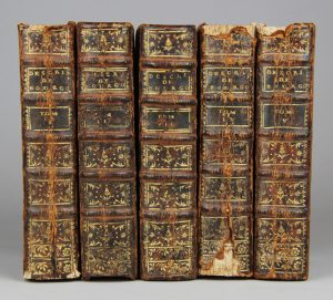 5 volumes in-12, basane marron, dos lisses ornés, tranches rouges (Reliure de l‘époque).