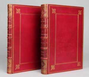 2 tomes in-4° de [32]-17-316-[8]-6-[4]-32-45 et [8]-674-[12] pages, maroquin rouge, plats à la Du Seuil, dos richement ornés, dentelles intérieures dorées, tranches dorées sur marbrure (Bruyère).