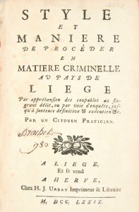 ▬ Style et maniere de procéder en matiere criminelle au pays de Liege par appréhension des coupables au flagrant délit, ou par voie d'enquête, jusqu'à sentence définitive & exécution &c. Par un citoyen praticien.