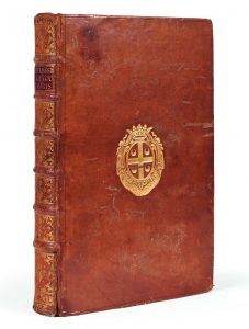 In-folio, dos à nerfs orné avec pièce de titre de maroquin rouge, veau fauve, armes dorées au centre des plats double filet doré sur les coupes, tranches rouges (reliure de l' époque).