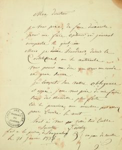 Lettre de prison, à propos d'un certificat médical: "Monsieur Lébut a eu la bonte lui en persone de se rendre chez Monsieur Lisfranc il a obtenu vottre déclaration que pour gage de reconaissence. Voyé sil et possible de vous doner la peine venir aupres de moi pour achever vottre declaration que je vous dirai que monsieur le president me la déjà demander de noveaux"...