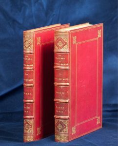 Paris, Jean Couterot, 1681-82. 2 tomes in-4° de [32]- 17-316-[8]-6-[4]-32-45 et [8]-674-[12] pages, maroquin rouge, plats à la Du Seuil, dos richement ornés, dentelles intérieures dorées, tranches dorées sur marbrure (Bruyère, relieur). Ce livre est un des plus recherchés de ceux dont une bibliothèque lyonnaise doit être composée. C’est un tableau brillant de l’excellence et des prérogatives des abbés, où l’auteur raconte l’origine du monastère, les hauts emplois des abbés sous les archevêques de Lyon, la réputation de sainteté des moines, les vicissitudes du couvent jusqu’à son entière ruine. Cet exemplaire est complet de tous les suppléments parus par la suite au XIX° ; ils sont reliés dans le premier tome (Catalogue des abbesses de Saint Pierre, Liste de quelques moines, Supplément aux Mazures (Rivoire, 1846), Projet de la seconde partie des masures, Table des maisons nobles, Epistola Leydradi avec la notice historique par l’Abbé Roux (1843).). En outre, ce premier volume est enrichi d’une constitution manuscrite de rente annuelle de 500 livres, datée du 13 Juillet 1675, signée de Claude Le Laboureur. SUPERBE EXEMPLAIRE RELIE PAR BRUYERE, RELIEUR ET DOREUR LYONNAIS