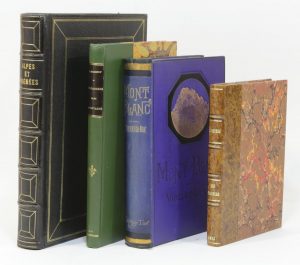 Mont Blanc. A Treatise on its Geodesical and Geological Constitution. London, Sampson Low, Marston, Searle, & Rivington, 1877 ; cartonnage de l’éditeur toile bleue, illustration dorée et titre en noir sur le premier plat, restaurations grossières aux coiffes.