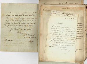 Azaïs (à propos d’un discours à l’Athénée), Louis Alloury (2, relatives aux Débats), Berville père, Jean-Joseph Courvoisier (remerciant des Principes de morale et de politique), Raymond-Dominique Ferlus (4 de Sorèze, amicales), Antoine-François Fourcroy (conseils du Grand Maître de l’Université sur des bourses), Germain Garnier (8), Joseph-Marie de Gérando (2), Martial de Guernon-Ranville (annonce d’une indemnité ministérielle), François Guizot (2, dont une sur le vœu d’Azaïs d’entrer à l’Académie des sciences morales et politiques), Marc-Antoine Jullien de Paris (déclinant un article pour la Revue encyclopédique), Auguste-Hilarion de Kératry (évoquant Des compensations dans les destinées humaines), Paulin (proviseur du lycée de Toulouse), la comtesse de Saint-Aulaire, Louis-François de Tryon-Montalembert (appelant Azaïs un « bienfaiteur de l’humanité »), etc.