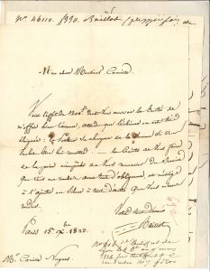 18 avril 1823. Il le prie de vendre sa rente de 330 francs : il disposera du surplus des fonds que M. Camille plaça pour lui, le capital devant être placé « en bons de la Trésorerie, ou de la manière que vous jugerez la meilleure »... 15 décembre 1823, pour l’envoi d’un effet de 1200F... 20 avril 1832. Il le prie de lui avancer 250 francs pour son loyer, à imputer « sur la petite rente qui m’appartient et dont je dois la continuité aux soins de votre bonne amitié »... 3 juillet 1833. MM. Pillet-Will et Cie vont rembourser 800 francs sur les 1420 ou 1440 avancés... On joint un reçu signé (1838), et un fragment de L.S.
