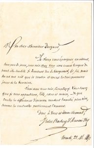 Jules BARBEY D’AUREVILLY (1808-1889). L.A.S., 22 [juin ?] 1852, à Jean-Marie Dargaud ; 1 page in-8 sur papier rose.