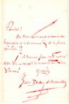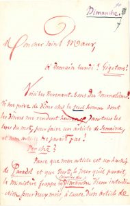 Jules BARBEY D’AUREVILLY. L.A.S., Dimanche [6 mars 1864], à Hector de Saint-Maur ; 2 pages in-8 à l’encre rouge avec la date à l’encre violette, soulignée et ornée d’une flèche à l’encre verte (petit trou au 2e feuillet sans...