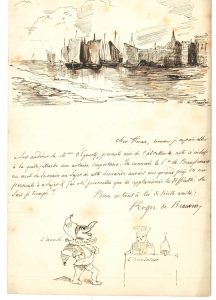 Il le prie d’intervenir auprès du prince de Beauffremont pour favoriser une demande : « On me persécute à ce sujet & j’ai osé promettre que tu applanirais la difficulté »... En haut, il a dessiné une vue de Venise, et en bas, un dessin humoristique représentant un bouffon, « L’accusé », devant un juge, « L’accusateur ».On joint un poème autographe signé de son fils Eugène, Le Grelot de Colombine, orné d’un dessin à la plume rehaussé d’encre rouge (Pierrot et Colombine au Bal Bullier), février 1872, dédicacé au baron de Watteville (3 p. in-4).