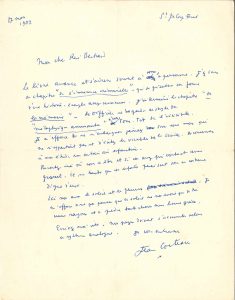 Jean COCTEAU. L.A.S., Saint-Jean-Cap-Ferrat 17 mars 1952, à René Bertrand ; 1 page in-4.