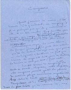 Chronique consacrée aux campeurs dans le Midi, parue dans Le Journal du 22 août 1935, et recueillie dans Colette journaliste. Chroniques et reportages (Seuil, 1910). Le manuscrit est abondamment raturé et corrigé, avec des passages biffés et des collages.La Côte d’Azur est envahie par les campeurs : « les tentes ont poussé sur la Côte comme champignons d’août. Nous avons les tchécoslovaques rouges, les russes blancs, les français jaunes… Je ne parle bien entendu que de la couleur des corps nus […] les blancs ne font que d’arriver, les rouges ont huit jours de brûlures, les derniers ne sont pas tout à fait cuits »… Les tentes se serrent sur les terrains de camping, et les plages sont congestionnées… Elle raconte l’histoire d’un campeur qui plante sa tente à côté de sa villa ; le mistral manque d’emporter la toile…Colette parle aussi de l’inconfort du campeur, et elle conclut : « Songez au long espoir de ceux qui gisent là, songez au chemin qu’ils ont couvert. Faites cet effort amical de mesurer, à sa patience, à son optimisme, à sa résignation, la vivace poésie du campeur : il est venu de très loin pour entendre murmurer les pins de Provence, et la mer. »