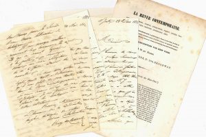 Intéressante correspondance autour de sa collaboration à la Revue Contemporaine. New York 12 octobre 1852. « Mon ami M. Adolphe de Puibusque m’a dit que vous étiez assez bon pour m’ouvrir les colonnes de votre Revue, & j’ai l’honneur de vous adresser en conséquence un premier article sur les travaux dans l’Amérique Centrale pour la Jonction des deux Océans ». Il précise qu’il désire publier sous le pseudonyme de C. de Laroche-Héron, « j’ai adopté ce nom dans L’Univers où mes publications paraissent depuis un an »... Il lui envoie ensuite un second article sur le même sujet, puis accepte de faire connaître la revue en Amérique et de s’occuper de la publicité, notamment en préparant un prospectus en anglais (joint) pour amener des souscriptions et des abonnements, en écrivant à son sujet dans des journaux français de New-York et du Canada, et en publiant des annonces dans les grands journaux américains, etc. Envoi d’autres articles : sur « La machine Ericsson qui fait beaucoup parler d’elle aux E.U. » avec schémas techniques ; sur « La Secte des Spiritualistes » ; un « article statistique, commercial & historique sur Cuba », etc... 14 avril 1854, à propos d’une polémique au sujet d’une Histoire du Canada « écrite dans un esprit très défavorable à la colonie » dont il a fait la réfutation dans le Correspondant, avec pour effet que l’Évêque d’Arras a retiré son approbation pour cet ouvrage... Etc. On joint un prospectus imprimé en anglais pour La Revue Contemporaine, sur lequel il a apposé ses initiales « H.C. »