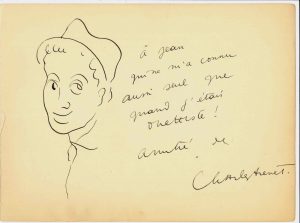 Autoportrait à l’encre noire, coiffé de son chapeau, dédicacé « à Jean qui ne m’a connu aussi seul que quand j’étais duettiste ! Amitié de Charles Trenet ». Au verso, P.A.S. de Guy Berry (1907-1982).