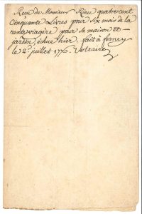 Quittance à Henri Rieu (1721-1787), son ami, acquéreur en 1775 d’une maison à Ferney. « Reçu de Monsieur Rieu quatre cent cinquante livres pour six mois de la rente viagère pour sa maison et jardin, échue hier »...