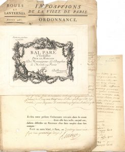 Actes de vente (1508-1512). Quittance des appointements de Georges Ricard, aumônier des îles Sainte-Marguerite et Saint-Honorat (1671). Lettre du chevalier de Bouillon à sa mère. Arrest notable de la Cour de Parlement sur la preuve du congrès (1677). Lettres du duc de Bouillon à l’abbé de Hautefeuille, au cardinal de Bouillon (1694-1698). Reçus fiscaux 1699-1728). Extrait de baptême signé par Esprit Fléchier, évêque de Nîmes (1708). Congé militaire (1714). Carton du bal paré pour le mariage du Dauphin (1745). Décharge de l’impôt des boues et lanternes, signée par Lenoir, lieutenant général de police (1782). Aveu et dénombrement, avis d’imposition, reçus, mandement épiscopal, etc. D’autres lettres et documents par Le Boiteulx, Machault d’Arnouville, le comte de Saint-Florentin...