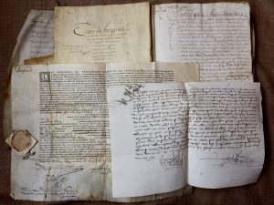 Ancien Régime. 17 manuscrits ou pièces, XVIe-XVIIe siècle ; la plupart sur vélin, qqs-uns en partie impr.