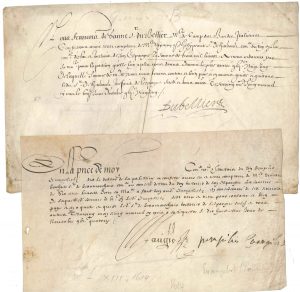 Pompilio Evangelista [da Palestrina] « dict le docteur de la Palestine », quittance de 600 livres, don de Sa Majesté « en consideration de ses services » (1614) [médecin et mage, appelé pour soigner les crises de somnambulisme du jeune Louis XIII]. François de Ganne [pour Galles], seigneur du Bellier, « maistre de camp des Bandes Italiennes », quittance de 3000 livres sur ordre du Roi (1621). Louis d’Escodeca baron de Boisse (frère de Pardaillan), quittance de 1800 livres « à nous ordonnee par Sa Majté » (1621). La Bastide, « lieutenant au gouvernement de la ville de La Cosne », quittance pour ses états et appointements (1630).
