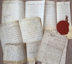 Lettre de bourgeois d’Arras (1708). Brevet de dame surnuméraire pour accompagner Madame Victoire en faveur de la marquise d’Estourmel, par Louis XVI (secrétaire) et Amelot (vélin, 1778). Beau brevet de réception de chevalier dans les ordres royaux, militaires et hospitaliers de Notre-Dame du Mont-Carmel et de Saint-Lazare de Jérusalem pour le marquis de Quemadeuc, signé par Louis-Stanislas-Xavier, comte de Provence (futur Louis XVIII), 1783 (vélin in-plano avec grand sceau pendant de cire rouge un peu accidenté). Inventaire après décès de Jean-Baptiste Buchère, maître en chirurgie à Palaiseau (1769). Placard mortuaire (1771, défauts). Actes divers dépendant de la « Seigneurie de Paloiseau » ou de la « Prévosté d’Igny ». Etc.
