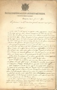 Rochefoucauld-Liancourt, inspecteur général des écoles d’arts et métiers ; 35 pages in-fol. ou in-4, qqs en-têtes École impériale d’Arts et Métiers aux armes impériales, École royale d’Arts et Métiers de Beaupréau ou Conservatoire royal des Arts et Métiers, qqs adresses, montées sur onglets et reliées en un volume in-fol., demi-vélin vert, pièce de titre au dos.