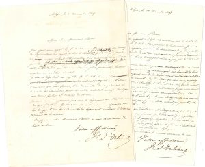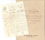 Important ensemble de correspondance du magistrat-administrateur au duc d’Aumale, concernant la gestion des affaires du prince depuis 1842 : la succession du duc de Bourbon ; la vente du Palais Bourbon à l’État ; l’aménagement du domaine de Chantilly ; l’exploitation des forêts de Chantilly, Clermont, Guise, Chateaubriant, etc. ; des transactions et propositions d’achat (la forêt du Lys, le bois de Royaumont, la forêt d’Aubenton, la forêt de l’Arouaise, etc.) après l’exil du prince en Angleterre et le décret du 22 janvier 1852 relatif aux biens de la famille d’Orléans ; des redditions de comptes ; des explications des conséquences économiques de « la révolution populaire » ; le transfert de fonds (par l’intermédiaire du général Dumas, ou entre banquiers français et anglais)... Notes et rapports sur le personnel de l’administration, les pensions et les rentes... Correspondance de Laplagne-Barris aux membres du gouvernement et aux administrateurs du séquestre, concernant les biens de la liste civile et du domaine privé du duc ; minutes de sa correspondance avec le duc... Carte du domaine de Chantilly (fentes), relevé de sa contenance par un expert-géomètre... Instructions, autorisations, procurations et reçus du duc d’Aumale, depuis Alger, Naples, Londres etc. Notes de frais des administrateurs, bordereaux de pièces communiquées au duc, états de paiements, inventaires d’objets... D’autres documents signés ou autographes signés d’Adolphe Couturié, secrétaire du duc d’Aumale ; Cuvillier-Fleury, secrétaire des commandements du duc ; Robin, receveur central des finances du duc, et Duquenel, receveur de ses domaines ; Camille Fain, secrétaire du cabinet du Roi ; La Martinière, sténographe judiciaire ; le comte de Montalivet, intendant général de la Liste civile ; Victor Touchard, aide-de-camp du prince de Joinville... Etc.On joint 7 imprimés (un doublon), mars-avril 1852 (brochures in-8), relatifs au décret du 22 janvier 1852 confisquant les biens donnés par Louis-Philippe à ses enfants le 7 août 1830 (patrimoine de la famille d’Orléans). Mémoire à consulter et consultation par MM. de Vatimesnil, Berryer, Odilon Barrot, Dufaure, Paillet... – Distribution d’écrits destinés à la défense. Explications de M. Bocher et plaidoiries de M. Odilon Barrot. – Réponse de M. Bocher à M. Granier de Cassagnac, rédacteur du Constitutionnel. – Seule question : le 7 août 1830, une loi en vigueur ordonnait-elle la réunion, à l’État, des biens donnés ? – Question de compétence. Plaidoiries de MM. Paillet et Berryer. – Conseil d’État. Section du Contentieux. Observations contre l’arrêté de conflit pris par M. le Préfet de la Seine... Plus le réquisitoire de Pinard, substitut, dans l’affaire du duc d’Aumale dans la succession du maréchal prince de Soubise (1858).