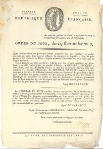 Campagne d’Égypte. 2 ordres du jour imprimés, Q.G. du Kaire 29 thermidor VII et 13 vendémiaire VIII (16 août et 5 octobre 1799), signés respectivement par l’adjudant général Henry Sornet et l’adjudant général Jean-Gaspard-Pascal René...