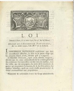 Déclaration de l’état d’urgence. – Décret de l’Assemblée Nationale du 10 août 1792 (impr. de Mallard) : « les corps administratifs et les conseils généraux des commune sont autorisés à vérifier dans les maisons, tant des villes que des campagnes, les armes et les munitions de guerre qui pourroient s’y trouver, et de les faire enlever des maisons suspectes »... – Loi relative à la déclaration présentée par la Commission Extraordinaire du 13 août 1792(Chaumont, chez Bouchard). La déclaration sera « publiée et affichée dans toutes les municipalités ; [...] elle sera lue à l’ouverture des assemblées primaires et électorales, et affichée dans les lieux de leurs séances », et à la tête de chaque bataillon des différentes armées...