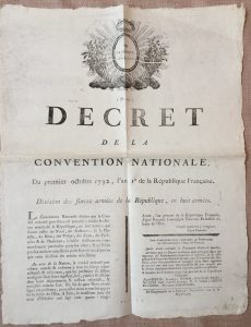 Georges Jacques DANTON. Affiche, Décret de la Convention Nationale … Division des forces armées de la République, en huit armées, 1er octobre 1792 (Rennes, impr. de J. Robiquet) ; 44,5 x 34,5 cm, vignette.