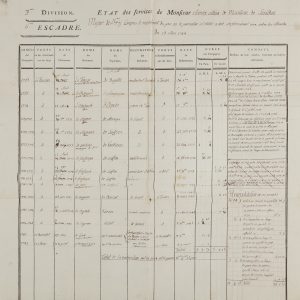 Bel ensemble sur la carrière du capitaine de vaisseau Étienne Massilian de Sanilhac (Montpellier 1748-1827). [Massilian de Sanilhac commença à servir dans la marine en qualité de volontaire en 1765. Il fut reçu garde de la marine le 12 janvier 1766, enseigne de vaisseau (1773) et lieutenant de vaisseau (1779). Chevalier de l’ordre de Saint-Louis en 1780 « en récompense d’une blessure reçue au combat livré devant la Grenade », il est ensuite promu major de vaisseau (1786) et enfin capitaine de vaisseau en 1814. Il a servi dans des bâtiments sous le commandement de Forbin d’Oppede, Castellane-Majastre, et surtout, dans plusieurs campagnes, sous Suffren, notamment en 1778-1779 lors des guerres d’Indépendance américaine. Il participa également à des campagnes en Méditerranée, à la guerre de Tunis (1770), dans le Levant, à Newport contre l’amiral Barrington (1778) et aux Caraïbes contre l’amiral Byron (1779). Franc-maçon, Massilian de Sanilhac était membre de la loge de la marine La Parfaite Harmonie de Toulon.]état des services en mer pour la période 1765-1789, grand placard rempli par Massilian de Sanilhac (plus une copie de 1816 avec lettre d’accompagnement). état de services à terre pour la période 1766-1791, établi par le Bureau des Revues de Toulon en 1815. Extrait du registre des conseils extraordinaires tenu le 7 octobre 1787 au bureau de la Majorité générale de la Marine pour l’examen des capitaines commandant des bâtiments à leur désarmement, délivrant à Massilian de Sanilhac un certificat pour bonne conduite durant la campagne sur les côtes françaises à bord du Gave. 12 lettres à lui adressées, relatives à l’attribution de sa décoration du Lys (1814), à sa pension de retraite (1815-1816, certaines par les ministres de la marine Beugnot et Gratet, plus le brevet de sa pension), à sa pension d’infirmité, à sa demande de pension en qualité de Chevalier de Saint-Louis (1825-1828, par le ministre Chabrol de Crouzol et le maire de Montpellier Cambacérès, plus une copie autographe de la demande de pension de Massilian auprès du ministre), etc.On joint 3 copies de pièces produites par les héritiers de Massilian (acte de décès, certificat de propriété, déclaration des héritiers), et une lettre du préfet de l’Hérault à eux adressée.