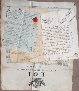 Affiche d’une Loi relative au corps de la Marine (1791). Copie d’un arrêté de Jeanbon Saint-André sur le traitement des officiers. Extrait de circulaire ministérielle concernant les prises de corsaire ; et « Instruction pour Biaggi » sur le même sujet. Billets de « part de prises » du capitaine Paul Salvy, commandant la Vigilante armée en Corse, ou son lieutenant H. Vial. Requête d’Antonio Vincenti, armateur du corsaire Le Lion. Lettre du ministre Forfait, reçus.