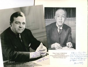 Louis de Broglie (photo dédic.), Jean-Claude Dalbos, Luther H. Evans (photo dédic.), Charles-Marie Gariel (photo dédic.), Emmanuel Jacquin de Margerie, Émile Merle d’Aubigné, etc. On joint 3 photos du hangar du Nobile et la princesse Pierre Murat.