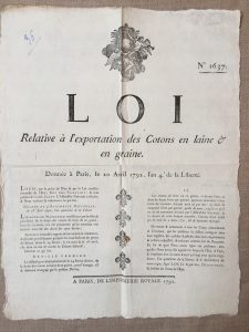 TEXTILE. Affiche, Loi Relative à l’exportation des Cotons en laine & en graine, 20 avril 1792 (Paris, Imprimerie royale, 1792) ; 46 x 36 cm, vignette.