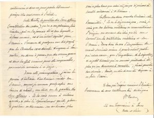 23 décembre 1877. Buloz lui avait proposé un an plus tôt d’écrire pour la revue « une étude portant jugement sur la nouvelle organisation de l’Armée », mais il avait décliné l’offre, craignant que « dans l’état très incertain des rapports internationaux en Europe, cette publication-critique ne serait pas sans péril ». Il expose son opinion actuelle à ce sujet et propose pour la revue « une étude sur la question des sous-officiers », qu’il ne signerait cependant pas... 30 avril 1881. Sur les méthodes de l’armée en Tunisie et la politique française dans ces territoires, face aux violences des tribus rebelles : réflexions sur les « bienfaits » des razzias de l’armée, sur le fanatisme des rebelles, etc. Il refuse d’écrire une étude sur « les campagnes du Maréchal Bugeaud », estimant que publier ces faits « qui ont occupé toute ma jeunesse militaire » et ses critiques, qu’il a exposées plus haut, seraient manquer au devoir patriotique, ne seraient plus utiles, et ne feraient que troubler l’opinion...