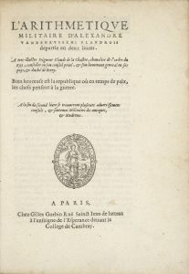 [BUSSCHE (Alexandre van den)] L'arithmetique militaire departie en deux livres. Paris, Gilles Gorbin [sic], s.d. [1571-1572].