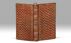In-12, maroquin rouge, plats et dos entièrement couverts d'un semé de fleurs de lis, dentelle intérieure, tranches dorées (Reliure de l'époque).