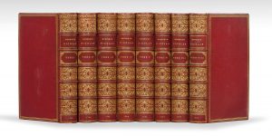 18 parties en 8 volumes in-12, maroquin rouge, triple filet doré sur les plats, dos à nerfs orné d'un décor d'entrelacs et filets dorés, double filet doré sur les coupes, dentelle intérieure, tranches dorées sur marbrure (Chambolle-Duru).