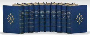Ensemble 10 volumes in-18, maroquin bleu roi, plats ornés d'un décor ovale central composé de phallus et de vulves entourant un faune en érection, dos à nerfs, tranches dorées, double filet doré sur les coupes, large dentelle intérieure dorée (Reliure du début du XXe siècle).