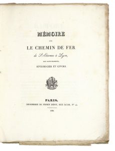 SEGUIN (Marc) Mémoire sur le chemin de fer de St-Étienne à Lyon, par Saint-Chamond, Rive-de-Gier et Givors. Paris, Imprimerie de Firmin Didot, 1826.