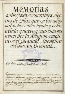 TONKIN. — MARTI (Domingo) Memorias sobre [la vida y muerte de] XXVII venerables siervos de Dios, que en los anos mil ochociontos treinta y ocho, treinta y nueve y cuarenta murieron por la Religion catolica en el Vicariato Apostolico, del Tun Kin...