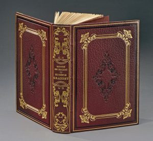 Un volume, grand in-8, pleine reliure en maroquin prune. Dos lisse décoré d’un large fer art nouveau doré encadrant le titre doré. Fer à froid au centre des plats dans un encadrement doré art nouveau. Filet et roulette doré sur les coupes, tranches dorées, contre plats doublés de maroquin vert d’eau, et encadrés d’un listel de maroquin prune souligné de nombreux filets dorés. Couverture et dos conservés. Gardes doublées de tissu moiré. Couverture de protection en demi maroquin à rabat titrée au dos, étui de luxe bordé de peau et doublé, à l’intérieur, de feutrine.