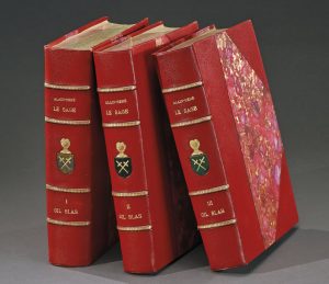 Trois volumes, in-4, demi-reliures à coins en peau maroquinée cerise. Dos à 4 nerfs décorés et mosaïqués d’un écusson armorié surmonté d’un heaume doré, titres dorés, roulette dorée sur les nerfs, têtes dorées, non rognés, couvertures et dos conservés.